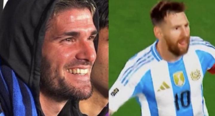 在梅西完成帽子戏法后,场边的德保罗露出了笑容,这一张照片在网上火了起来。