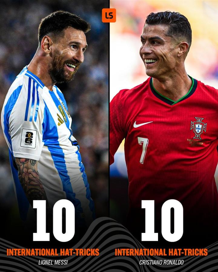 在对阵玻利维亚的世预赛上演帽子戏法后,梅西国家队生涯已完成了10次帽子戏法,追平了C罗国家队生涯的戴帽次数。