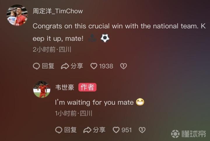 韦世豪则回复道:I’m waiting for you mate(我在等你,队友!)