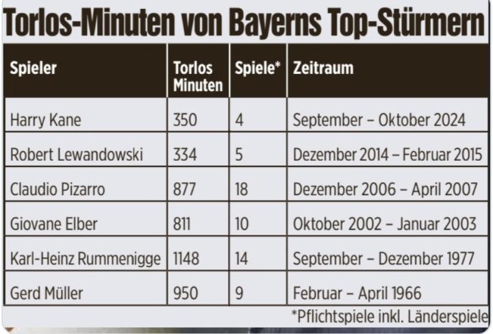 据数据统计,拜仁前锋哈里-凯恩遭遇350分钟进球荒,超过了莱万在拜仁时期的最长纪录。