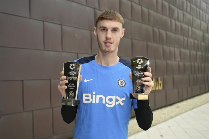 当地时间周四,帕尔默领取了PFA年度最佳球员前六名和年度最佳年轻球员前六名奖杯。
