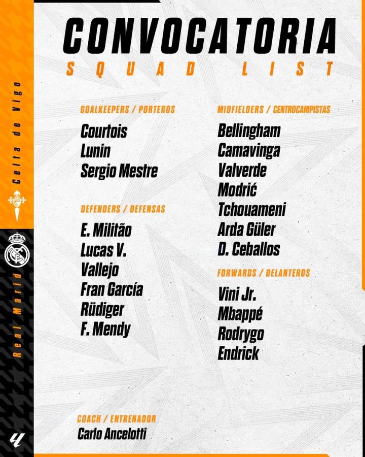 皇家马德里官方公布了西甲第10轮客场对阵塞尔塔的比赛大名单,姆巴佩领衔,库尔图瓦回归,比赛将于北京时间10月20日凌晨3点进行。