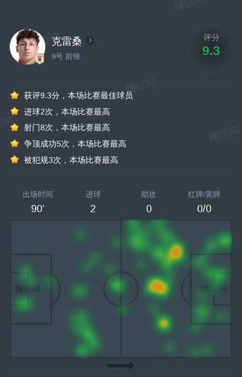北京时间10月18日山东泰山vs天津津门虎,克雷桑贡献2球,2次关键传球,8次射门,3次成功过人。