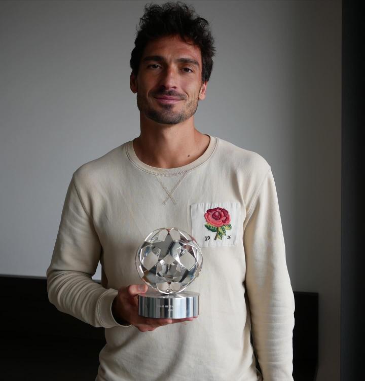 胡梅尔斯在社交媒体晒出他领取上赛季欧冠最佳阵容奖杯的照片,并调侃称拿奖次数比本赛季出场次数还多。