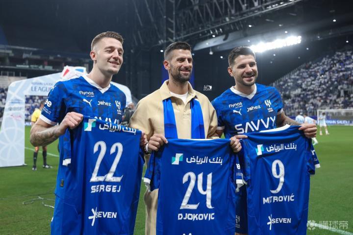德约科维奇还和利雅得新月的两名塞尔维亚球员米林科维奇-萨维奇和米特罗维奇一起手捧新月球衣拍摄了合影,而他的球衣号码则是象征着他的大满贯冠军数量的24。