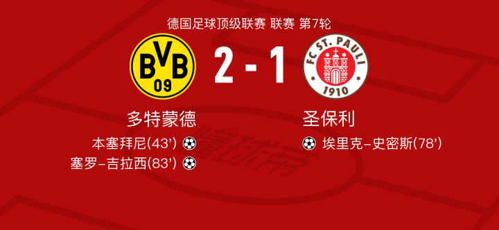 北京时间10月19日多特蒙德vs圣保利,本塞拜尼得到全场最高的8.4分,魏特延得到全场最低的5.9分