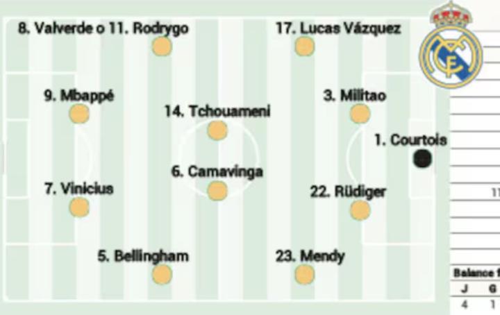 中场:楚阿梅尼、卡马文加、贝林厄姆、巴尔韦德(罗德里戈)