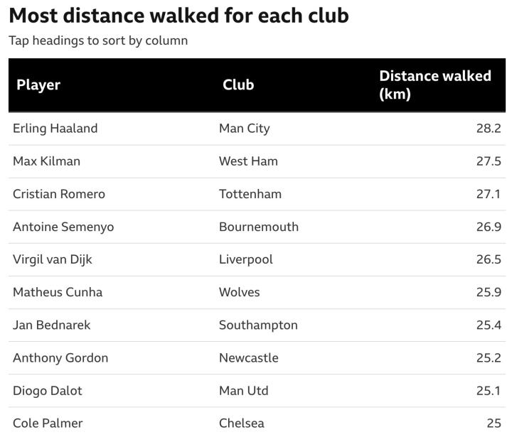 近日,BBC体育和OPTA数据公司对本赛季英超至今球员的一些指标及数据进行了统计,其中就包括非门将球员在场上的“散步”(原文Walk)总距离。而在此项榜单中排名居首的是目前英超的射手榜头名,哈兰德。