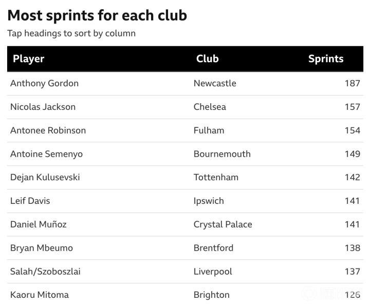 值得一提的是,哈兰德同时也是曼城队中冲刺次数最多的球员,这直接指向了他在球场上的战术定位。而其他几位同样在队中兼有“散步”最多和冲刺最多身份的分别是纽卡斯尔的戈登、富勒姆的罗宾逊、伯恩茅斯的塞门约、伊斯普维奇的后卫戴维斯和曼联的达洛特。