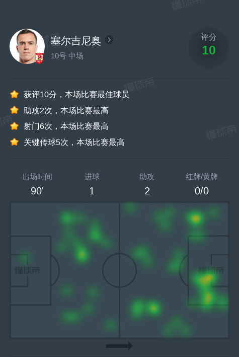 北京时间10月19日长春亚泰vs青岛西海岸,塞尔吉尼奥贡献1球,2助攻,5次关键传球,6次射门,2次成功过人。