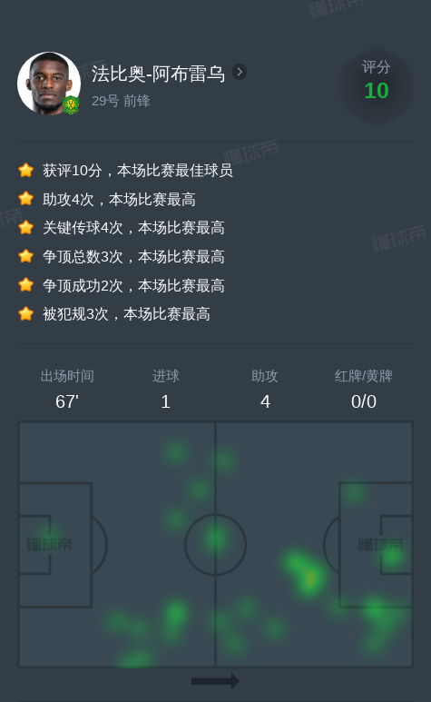 北京时间10月19日北京国安vs青岛海牛,法比奥-阿布雷乌贡献1球,4助攻,4次关键传球,1次射门,1次成功过人。
