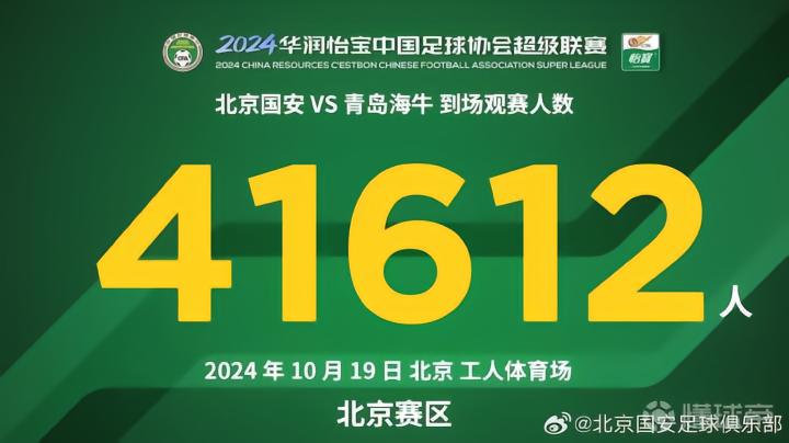 中超第28轮,北京国安主场6-0大胜青岛海牛,本场比赛现场观众人数为41612人。