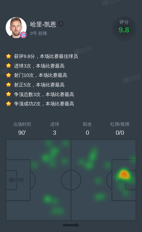 第81分钟,状态回来了,哈里-凯恩门前补射破门成功戴帽,拜仁3-0