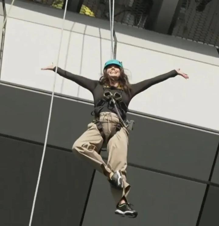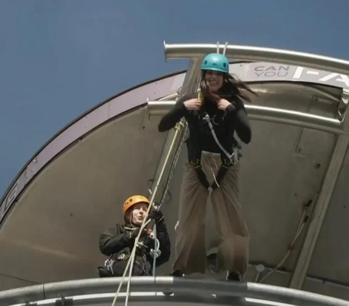 36岁的Becky Ives在拥有62000个座位的体育场顶部开始了直播,并用北伦敦的壮丽景色欢迎观众。在告诉球迷接下来会发生什么之后,她转身离开镜头,在安全设施的保护下从体育场顶部纵身一跃,嘴里大喊 “敢于尝试”。