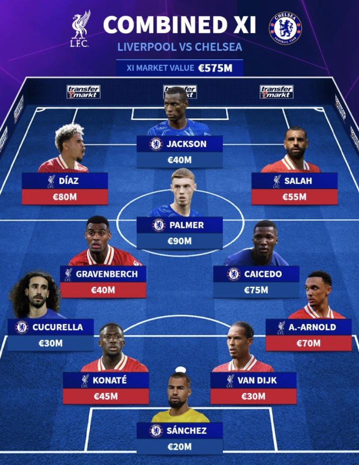 北京时间10月20日晚,英超第八轮,利物浦将对阵切尔西。赛前,德国转会市场列出了两队合体阵容。