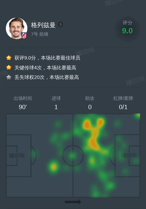北京时间10月20日马德里竞技vs莱加内斯,格列兹曼贡献1球,4次关键传球,2次射门,2次成功过人。