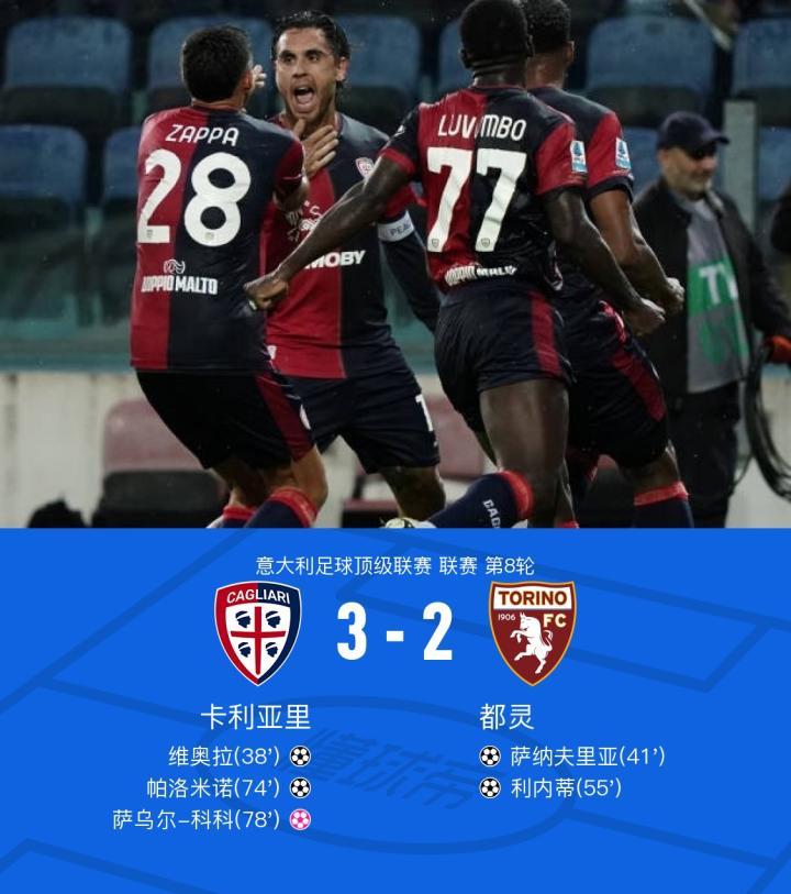 卡利亚里3-2都灵,维奥拉、帕洛米诺破门,萨乌尔-科科乌龙