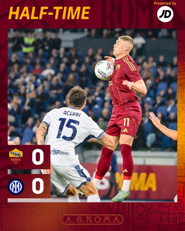 在意甲第8轮的比赛中,罗马在半场结束后主场0-0与国际米兰打成平手。上半时两队各有一次击中门框,蓝黑军团则遭遇了恰尔汗奥卢和阿切尔比先后受伤下场的情况。