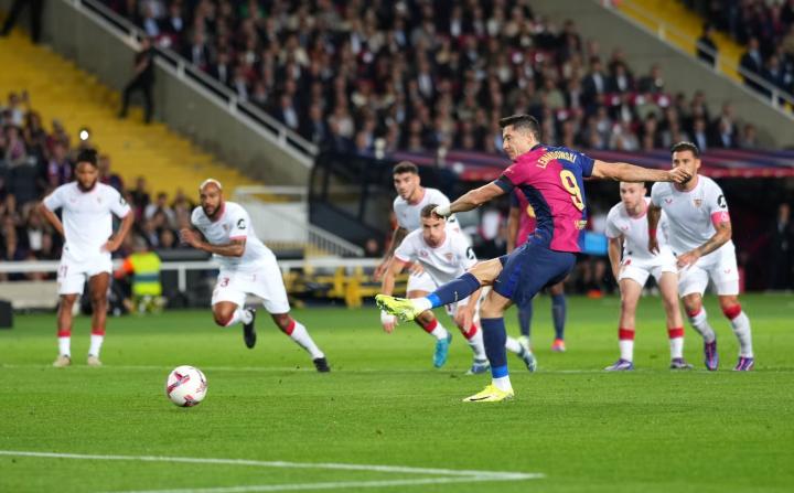 西甲第10轮主场迎战塞维利亚的比赛中,莱万多夫斯基点球破门为巴塞罗那首开记录。