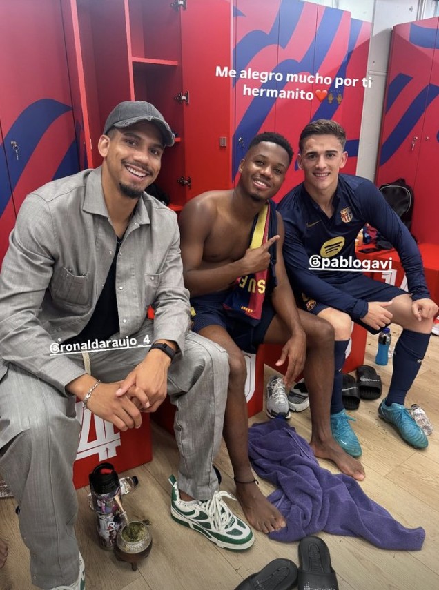 比赛结束之后,法蒂晒出了在更衣室内与加维和阿劳霍的合照,并配文写道:“为你感到非常高兴,小兄弟加维。”