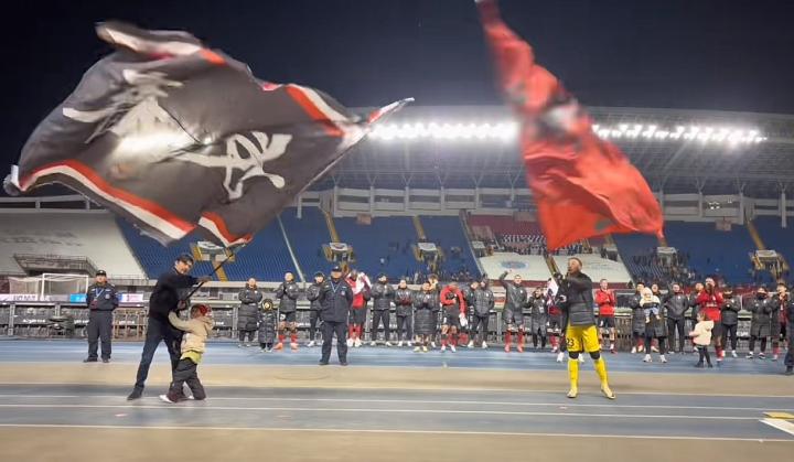 最终,4-0赢下这场比赛后,谢晖依旧与队员们一起绕场一周感谢球迷,并习惯性地挥舞着印有“长春”二字的大旗,与球迷同乐。