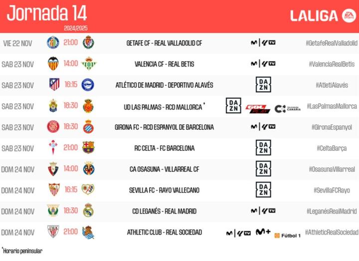 西甲官方公布了西甲第14轮比赛开球时间,塞尔塔vs巴塞罗那将于北京时间11月24日凌晨4点开打,莱加内斯vs皇家马德里的比赛将于11月25日1:30进行。