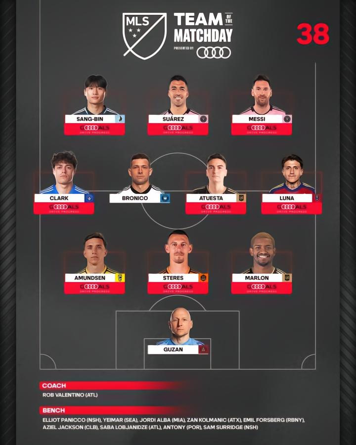 美职联官方公布了第38轮最佳阵容,梅西、苏亚雷斯领衔。