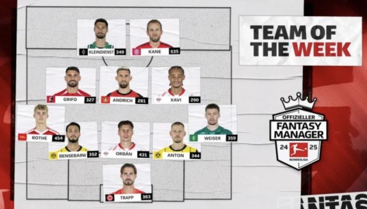 中场:汤姆-罗特(柏林联合)、格里福(弗赖堡)、安德里希(勒沃库森)、哈维-西蒙斯(莱比锡)、魏泽(云达不莱梅)