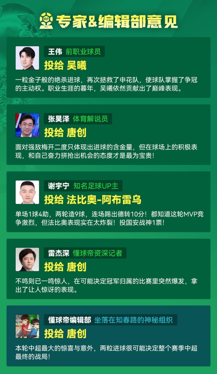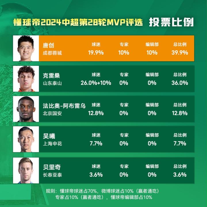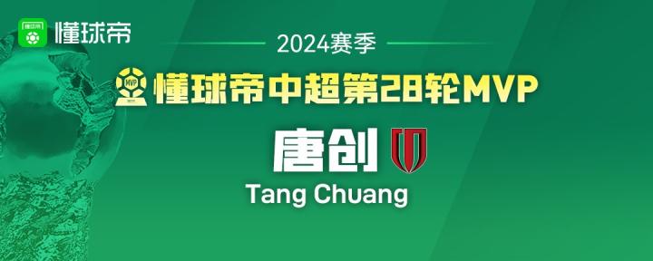 大家好,欢迎来到懂球帝2024赛季中超MVP评选现场。中超第28轮MVP的最终获奖者,属于成都蓉城队的中锋唐创!