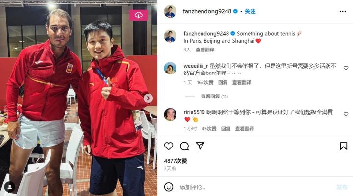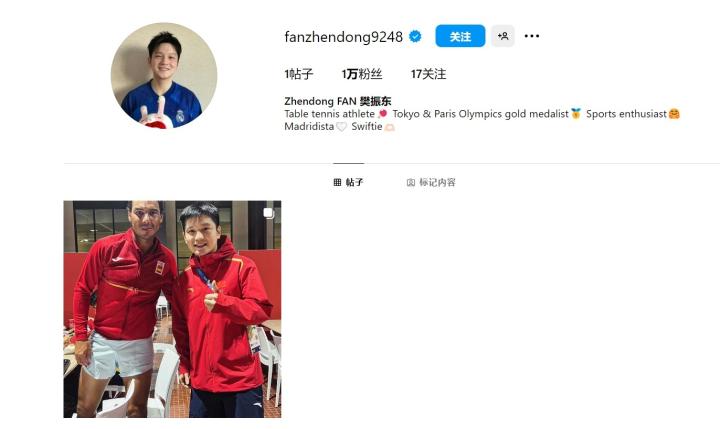 根据账户简介,樊振东的账号在2024年9月注册成功,2024年10月完成认证。目前账号内只发布了一条内容,是他参加上海网球公开赛的一些活动照片。