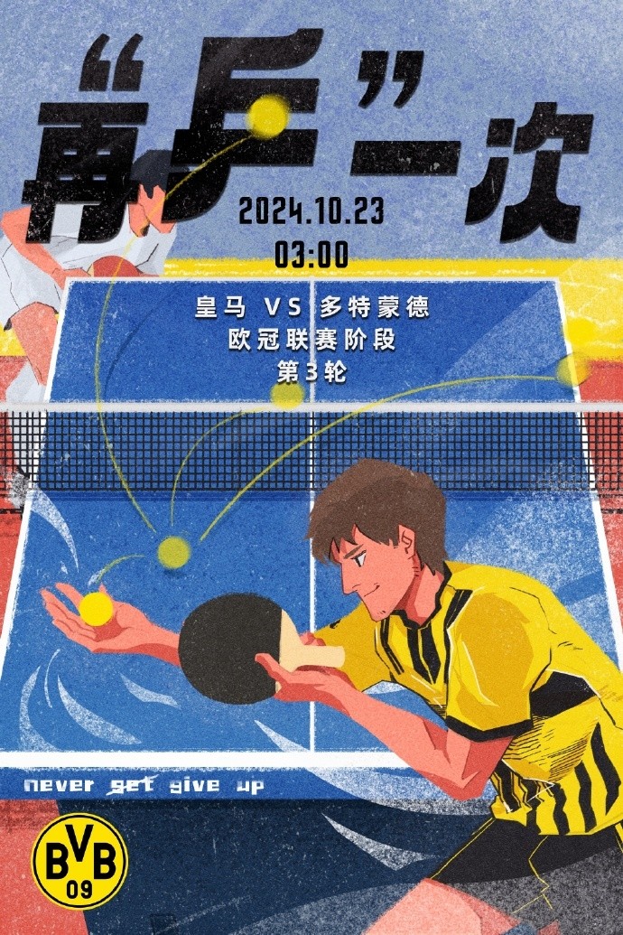 海报以“再‘乒’一次”为主题,身穿皇马、多特球衣的两人分别站在乒乓球台两端。虽然穿着皇马球衣的人看起来是瓜子脸和樊振东的形象不符,但乒乓球桌上“never get up”的字样还是cue到了东哥。