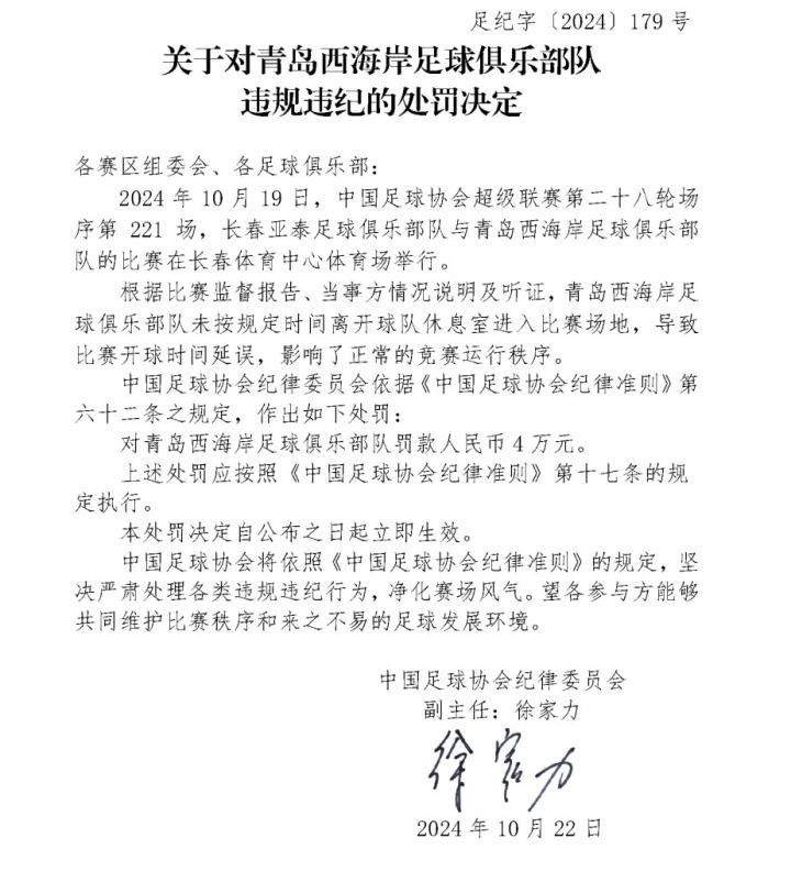 10月22日,中国足协官方发布处罚公告,青岛西海岸未按规定时间离开球队休息室进入比赛场地,导致比赛开球时间延误,被足协罚款4万元。
