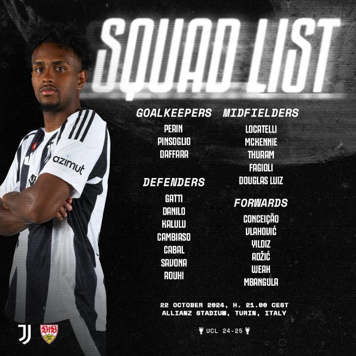 北京时间10月22日,尤文官方公布欧冠战斯图加特的大名单,弗拉霍维奇领衔,麦肯尼回归,冈萨雷斯、库普梅纳斯伤缺,迪格雷戈里奥因停赛无缘名单。