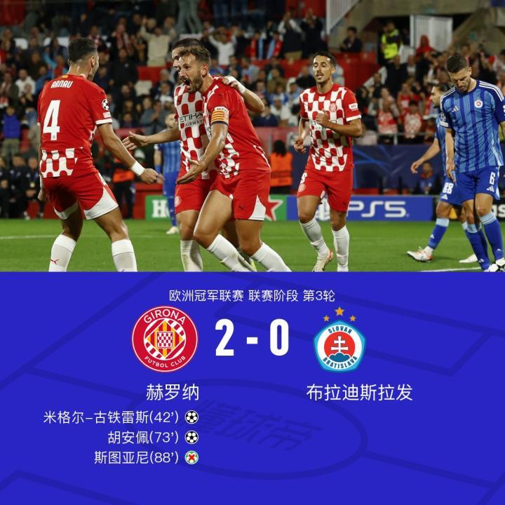 赫罗纳2-0布拉迪斯拉发迎队史欧冠首胜,胡安佩任意球破门