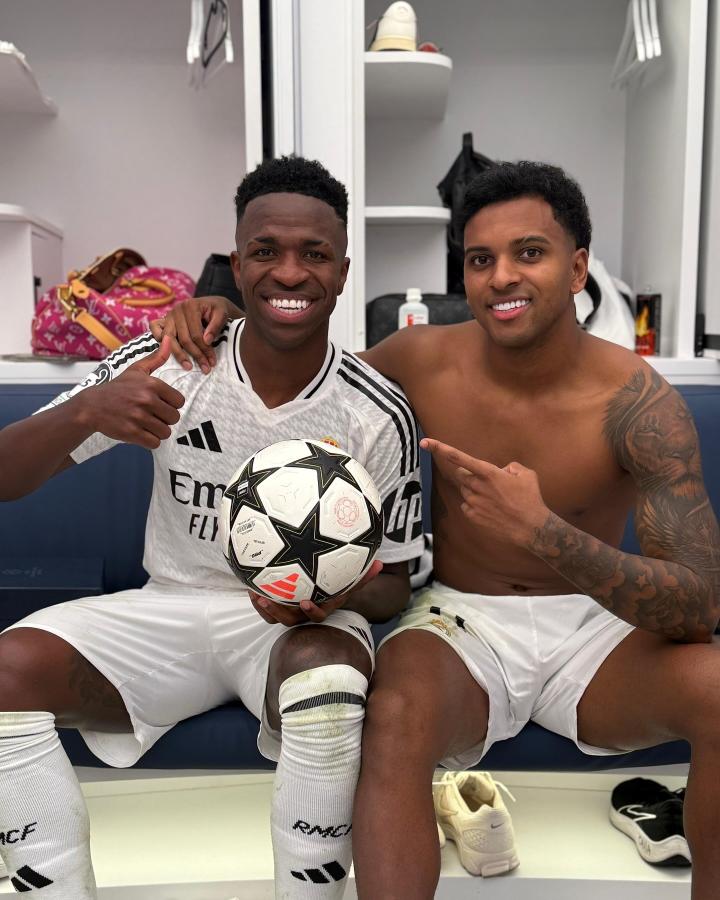 赛后,罗德里戈晒出照片,其中一张是他和维尼修斯在更衣室的合照,并写道:“在伯纳乌一个普通的欧冠之夜。维尼修斯⚽️⚽️⚽️”