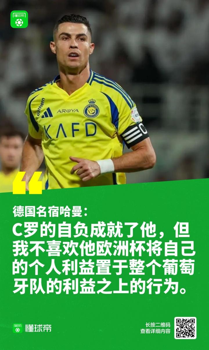 德国足坛名宿哈曼在接受Flashscore采访时谈到了C罗,称自负成就了C罗,并表示自己不喜欢他将自己的利益凌驾于整个葡萄牙队之上的行为。