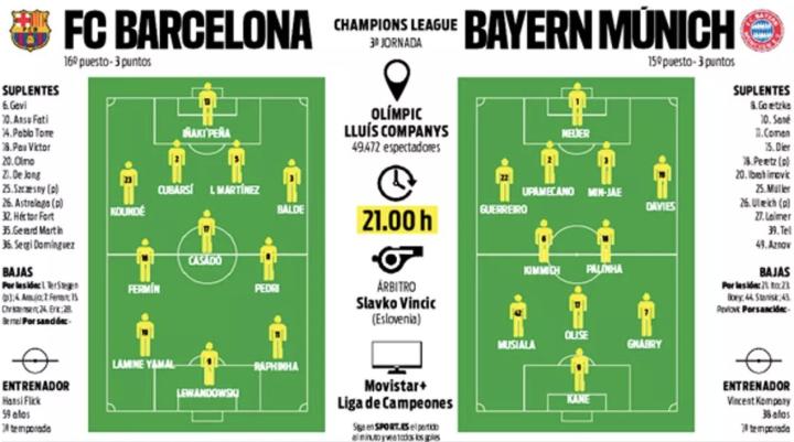 欧冠联赛阶段第三轮,巴塞罗那将在主场对阵拜仁慕尼黑,《每日体育报》预测了巴萨的首发阵容,莱万多夫斯基领衔,费尔明-洛佩斯首发出战。