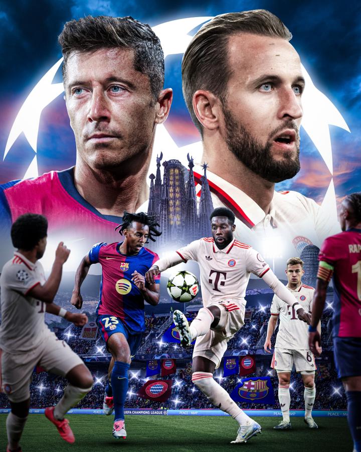 拜仁慕尼黑发布欧冠对阵巴塞罗那海报,凯恩和莱万多夫斯基的对决成为一大看点。