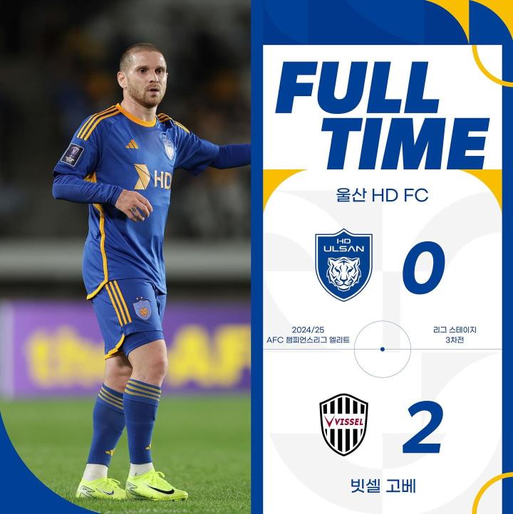10月23日,亚冠精英联赛的一场日韩对决,蔚山HD0-2不敌神户胜利船,遭遇三连败。