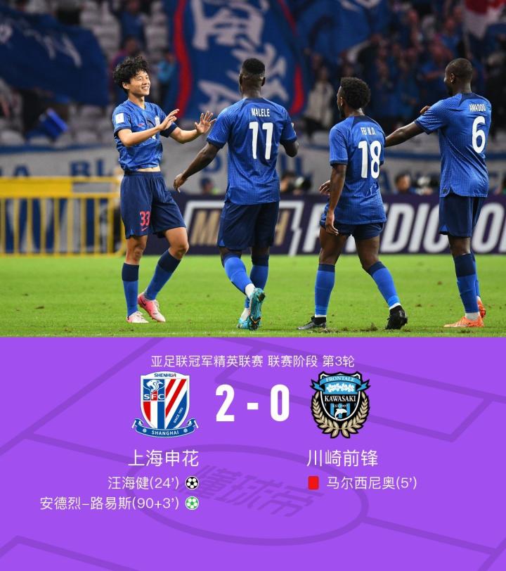 申花2-0十人川崎前锋,汪海健折射破门,路易斯点射锁定胜局