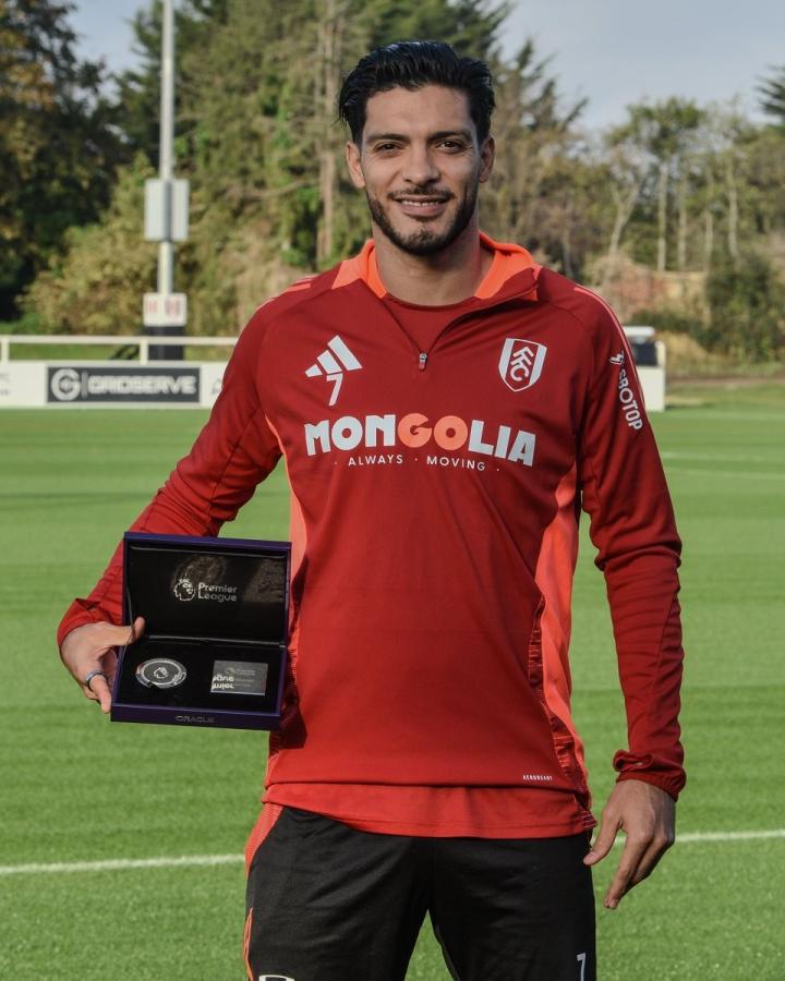 在达成英超50球里程碑后,富勒姆前锋劳尔-希门尼斯获赠纪念礼物。