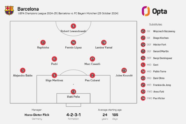 巴塞罗那公布了他们欧冠联赛阶段第三轮主场与拜仁慕尼黑比赛的首发阵容,11人平均年龄仅为24岁185天。