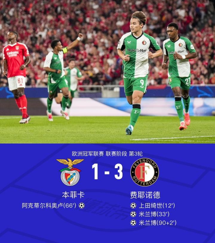 本菲卡1-3费耶诺德,米兰博双响,上田绮世破门
