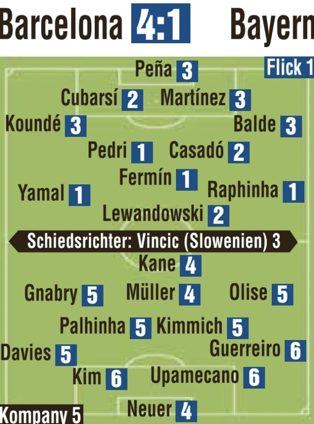 欧冠第三轮,巴塞罗那主场4-1大胜拜仁慕尼黑,《图片报》赛后为两队表现打分(1分最高,6分最低)。