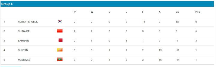 韩国首轮轮空,第二轮比赛中,韩国5-0大胜不丹国少,第三轮比赛中,韩国13-0大胜马尔代夫国少,目前韩国2战2胜积6分,净胜球为+18。