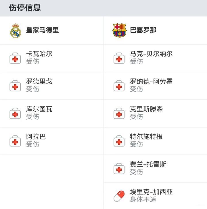 巴萨方面,在4-1战胜拜仁中,奥尔莫复出替补出场发挥出色,加维、德容也先后迎来了复出。与皇马经历欧战后伤兵满营截然不同的是,巴萨在比赛中无人受伤;球队受一周双赛的密集赛事影响较小,但此前伤员很多,后防线阿劳霍、克里斯滕森仍无法出场。
