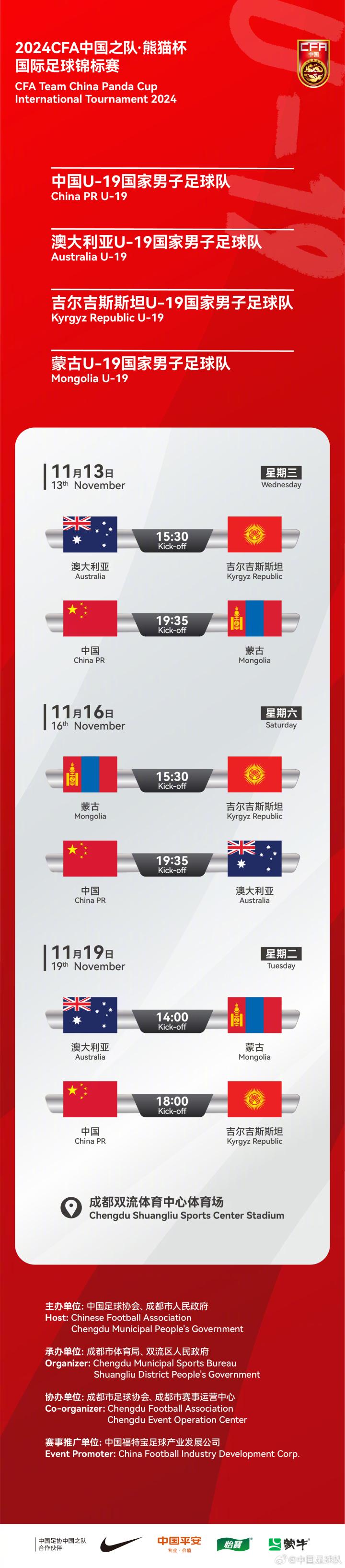 2024熊猫杯来啦! 中国U19国家男子足球队、澳大利亚U19国家男子足球队、吉尔吉斯斯坦U19国家男子足球队、蒙古U19国家男子足球队将于11月齐聚四川成都。
