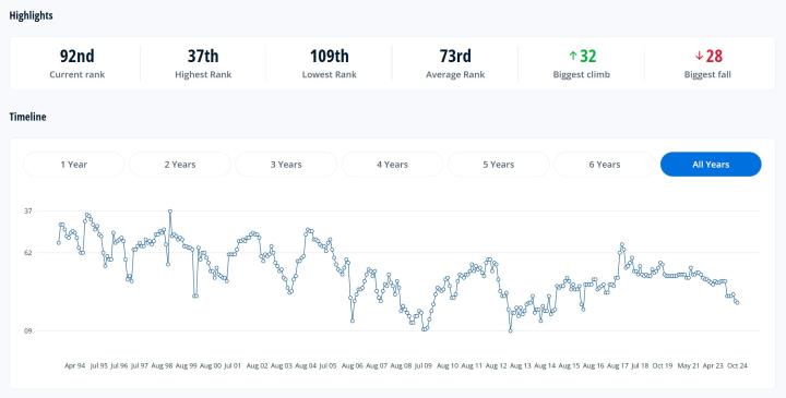国足的历史最高排名是世界第37位(1998年12月),最差排名是世界第109位(2013年3月),平均排名是世界第73位。