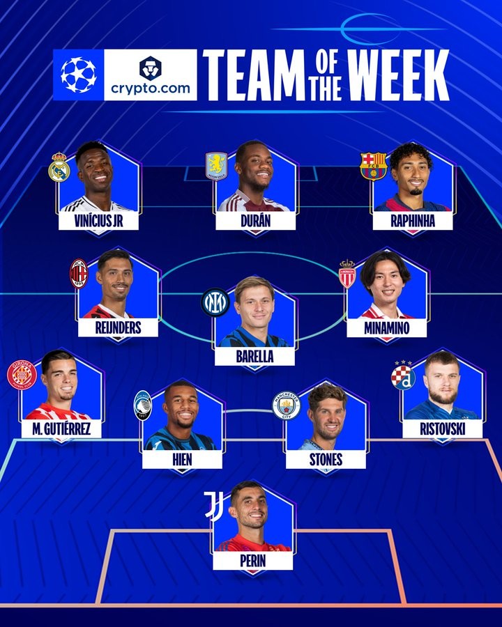 欧冠官方公布了联赛阶段第3轮的最佳阵容,维尼修斯、拉菲尼亚领衔,南野拓实、佩林在列。