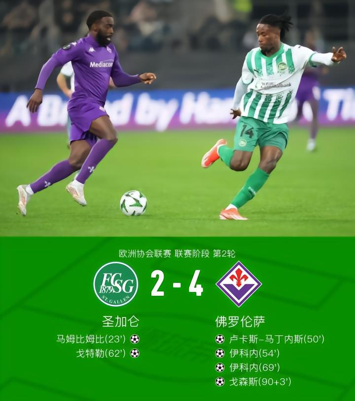 佛罗伦萨客场4-2圣加仑,伊科内双响,卢卡斯-马丁内斯建功
